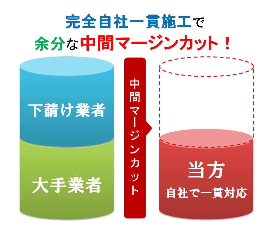 一方、自社施工店にご依頼いただいた場合は、中間マージンが発生しないため、余分な費用をカットしつつもハイパフォーマンスで施工することが可能なのです。