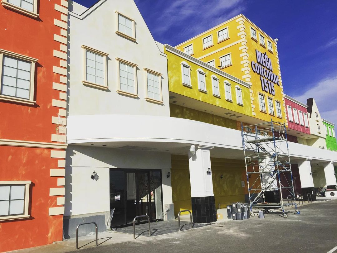 某アウトレットモールの店舗の施工の様子をご紹介いたします。モザイク塗装というかエイジングというか😁✨楽しくキレイに仕上がりました🧤外壁塗装・屋根塗装、モル