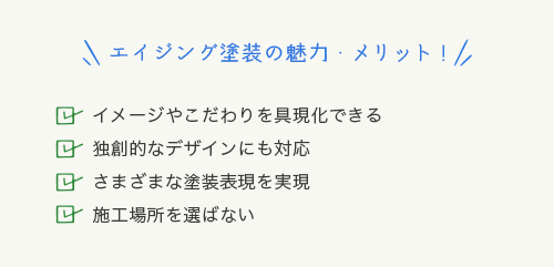 エイジング塗装とは特殊塗装の一種で、あたかも昔からその場所に存在していたかのような風合いに見せる外装の塗装技術のこと。