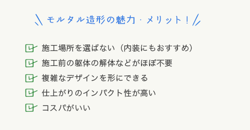 モルタルはコンクリートに非常に似ている素材で、外壁材として使用されることも多く、FRP(繊維強化プラスティック)造形には出せないリアルな重量感・存在感を出すことができます。